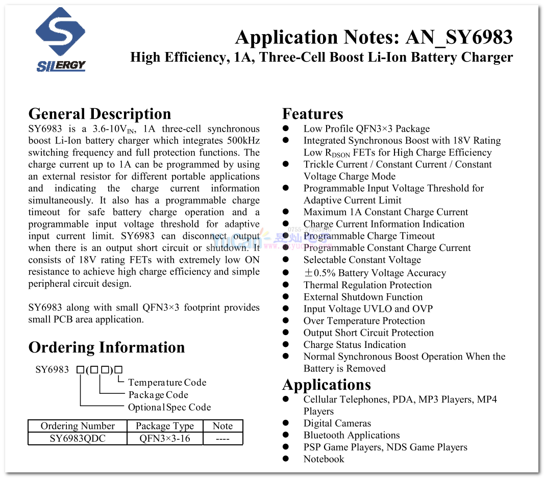SY6983 QFN3x3-16 5V輸入3節(jié)串連12.6V/13.5V 1A