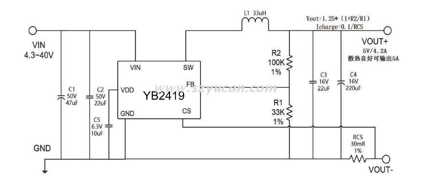 YB2419 40V 5A SOP8內(nèi)置MOS 200KHZ定頻 恒壓限流可調(diào) 具100%占空比高效率同步降壓 適用于車(chē)載供電等